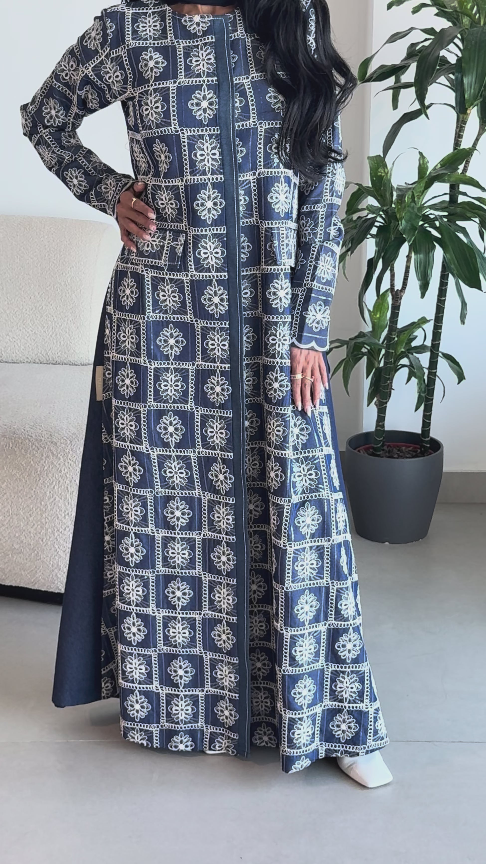 - Denim abaya with handmade floral embroidery on the front and a plain denim back